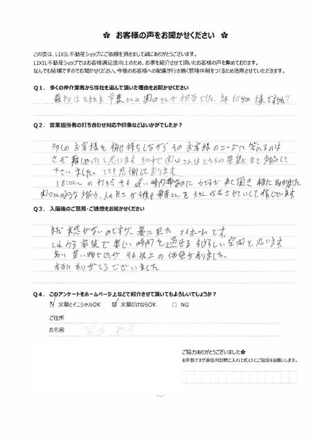 まだ実感がないのですが、夢に見たマイホームです。これから家族で楽しい時間を過ごせる素晴らしい空間と思います。高い買い物でしたがそれ以上の価値がありました。本当にありがとうございました。