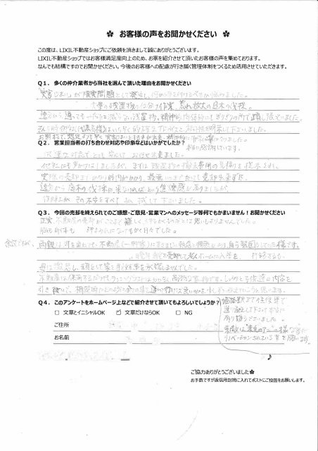 迅速な対応でとても安心してお任せ出来ました。他社にも声かけはしましたが、まずは残地物の撤去費用の見積もりを提示され、実際の売却までかなり時間がかかり、最悪いつまでたっても売却出来ずに遠方からに庭木の伐採に来なければという焦燥感が募りましたが、御社がその不安をすべて払拭して下さいました。
