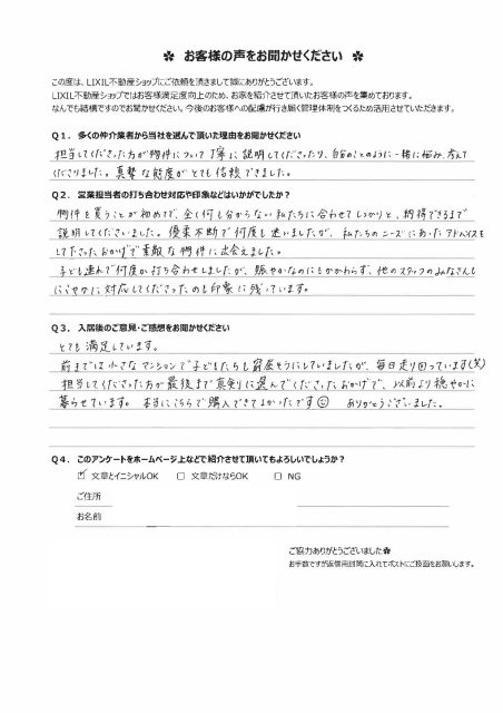 物件を買うことが初めてで、全く何も分からない私たちに合わせてしっかりと納得できるまで説明してくださいました。優柔不断で何度も迷いましたが、私たちのニーズにあったアドバイスをして下さったおかげで素敵な物件に出会えました。 子供連れで何度か打合せしましたが、賑やかなのにもかかわらず、他のスタッフのみなさんもにこやかに対応してくださったのも印象に残っています。