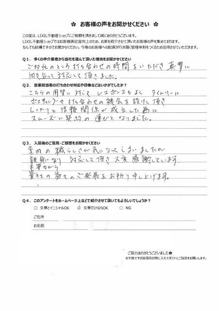 こちらの要望に対してレスポンスもよくタイムリーにポスティングや打合せの機会を設けていただきしっかりと信頼関係が成立した為にスムーズに契約の運びとなりました。